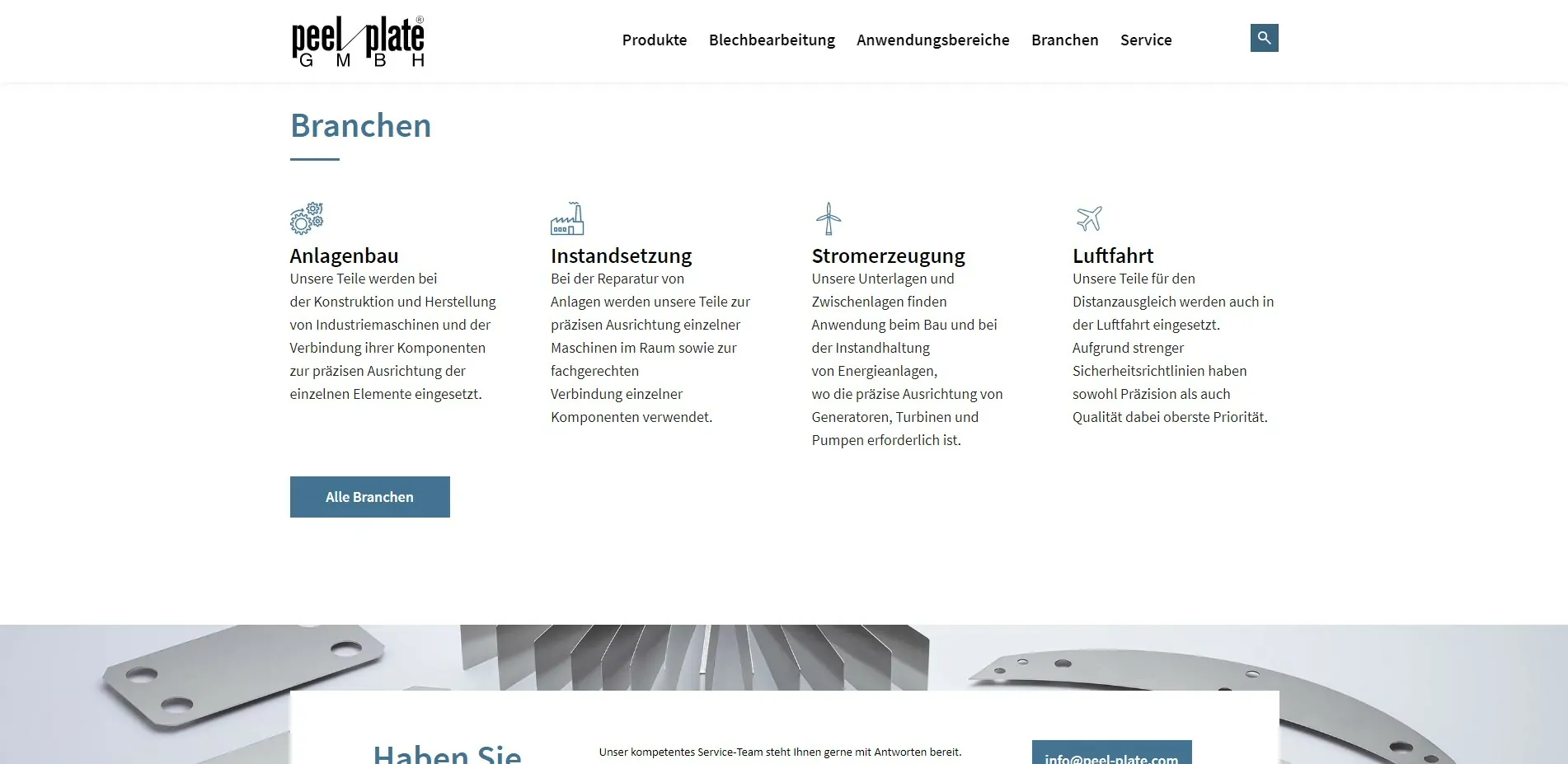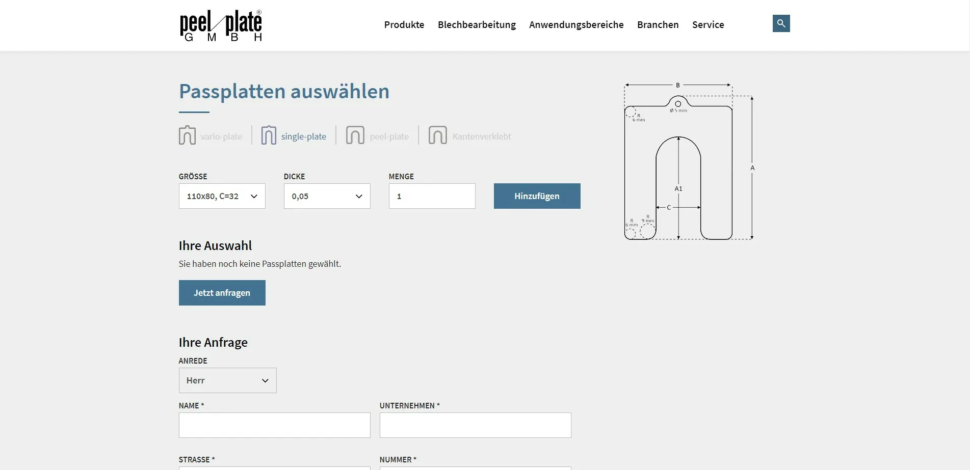 Der Fokus lag darauf, Anfragen konkreter bearbeiten zu können, so wurde bei den Anfrage-Formularen ein File Upload mit eingebunden, so dass technische Zeichnungen hochgeladen werden können. peel-plate kann so individuelle Angebote erstellen und konkret auf das Anliegen der Kunden eingehen.